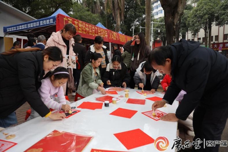 “在2026年新春来临之际,工会于开发区热闹区域开展了义务送春联活动,邀请了书法爱好者和小朋友共同参与。活动现场,大家不仅可以领取福字,还能亲自写春联。此外,还有书法老师、画画老师现场作画,为职工群众送上新春的祝福和美好的祝愿。小朋友们也能现场互动,体验拓印活动,并把作品带回家。”广西—东盟经开区总工会副主席李霞介绍。